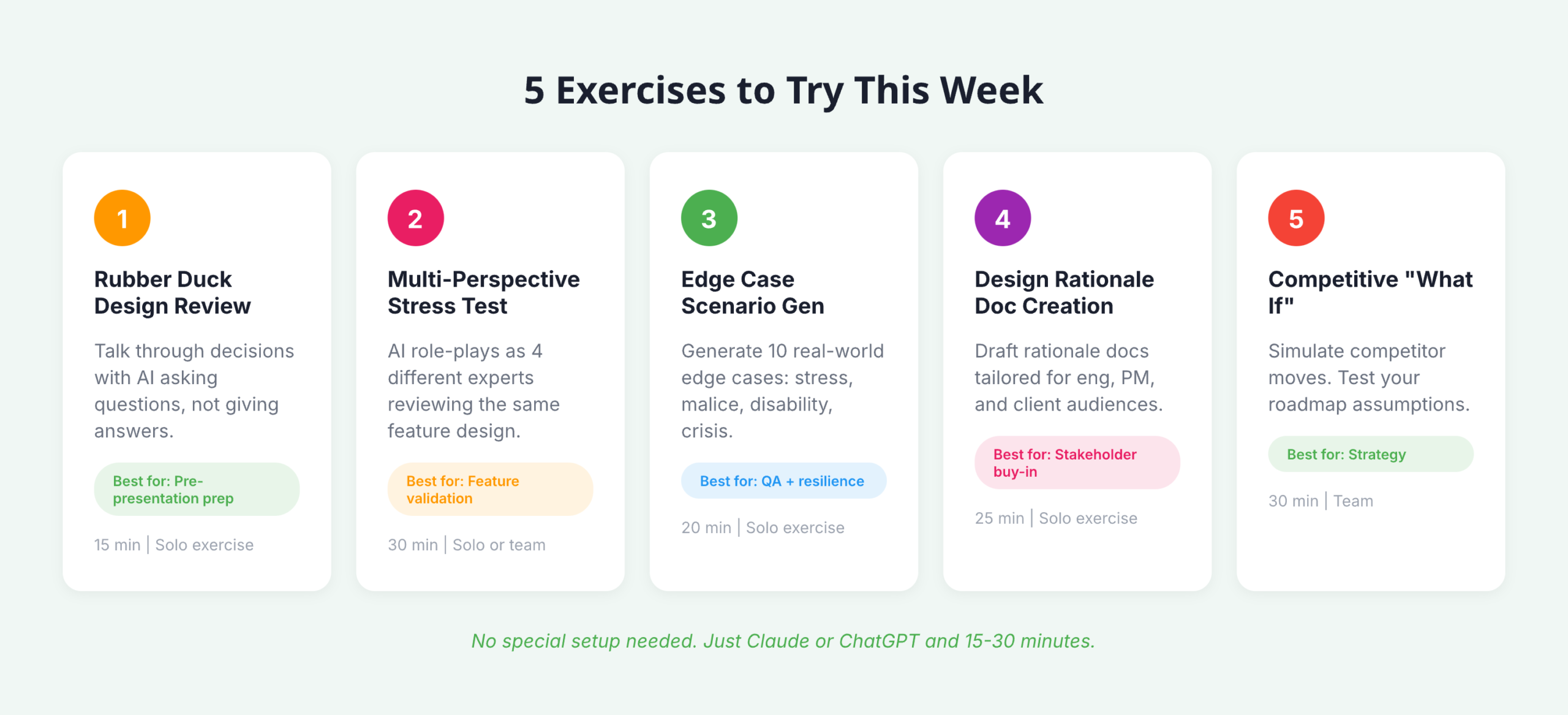 The gap between understanding AI-as-thinking-partner conceptually and using it effectively in practice is where most design teams stall. These five exercises, drawn from documented practitioner workflows, require no special setup beyond access to Claude or ChatGPT.