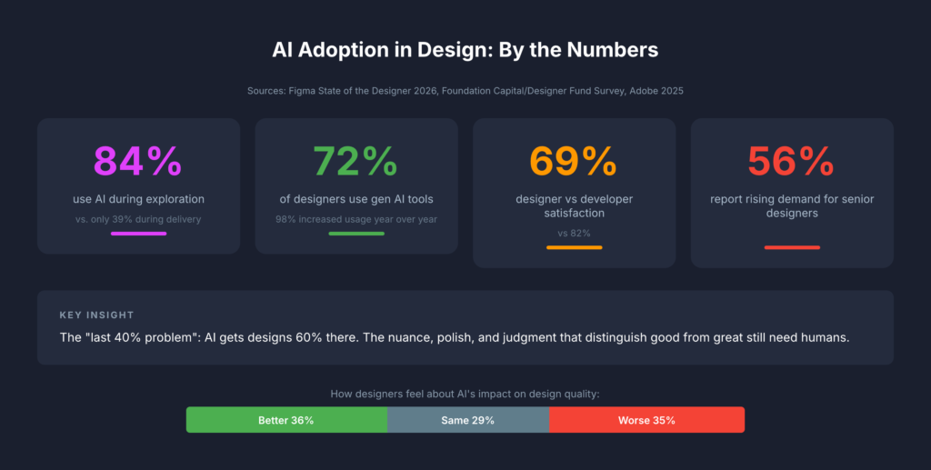 The sentiment data is perhaps most telling. Figma’s 2026 survey found designers split almost perfectly into thirds on whether design has gotten better (36%), worse (35%), or stayed the same (29%) since AI’s rise. NNGroup declared 2026 “the year of AI fatigue.” Yet 82% of hiring managers said their company’s need for designers has increased or held steady, and 56% specifically report increasing demand for senior designers, those who bring the judgment and strategic thinking that AI cannot replicate.