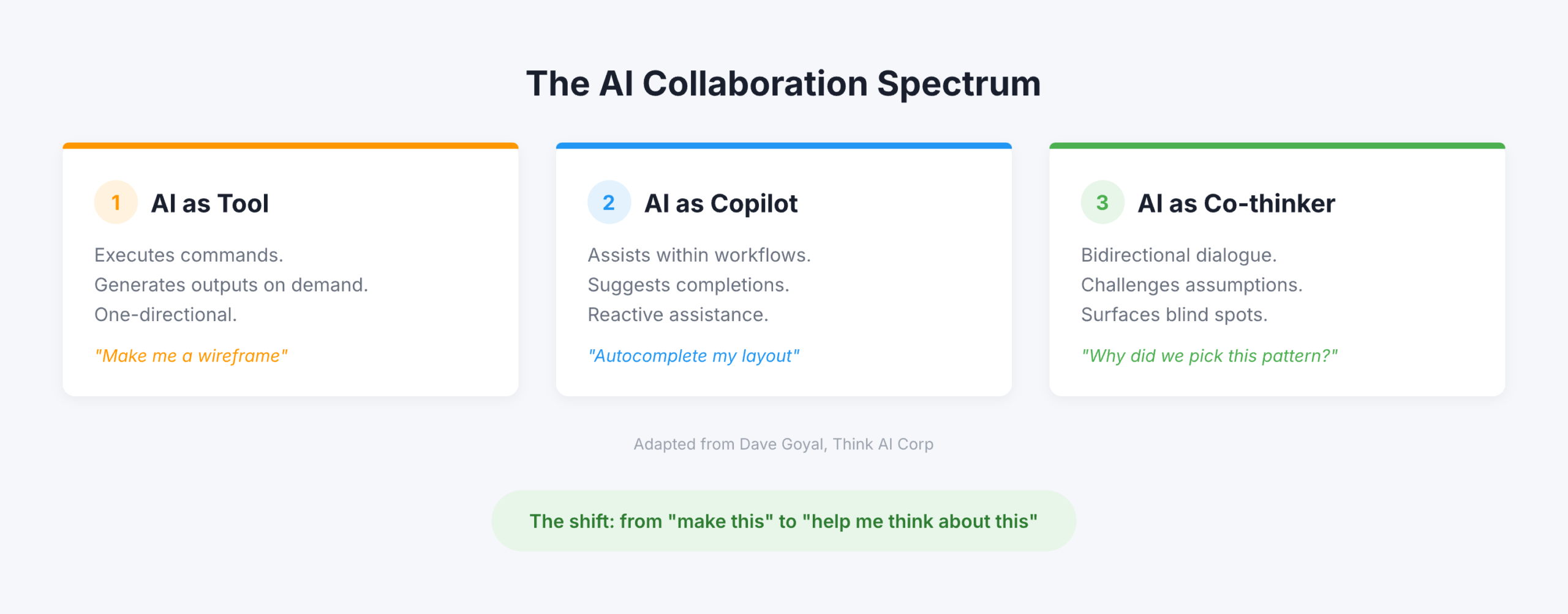 But the most useful framing for practitioners comes from Dave Goyal of Think AI Corp, who distinguishes between three levels. AI as “tool” executes commands and generates outputs. AI as “copilot” assists within workflows and suggests completions, what Goyal calls “a glorified autocomplete engine.” AI as “co-thinker” engages in bidirectional dialogue, challenges assumptions, and surfaces blind spots. The difference, Goyal argues, “is not in capability. It is in design intent.” Paul Boag of Smashing Magazine operationalized this most concretely: he creates Claude and ChatGPT projects loaded with client research, personas, survey results, and documentation, then uses the AI as “a co-worker who never gets tired and has a perfect memory.” Not to generate designs, but to challenge his thinking, review his work, and ask hard questions.