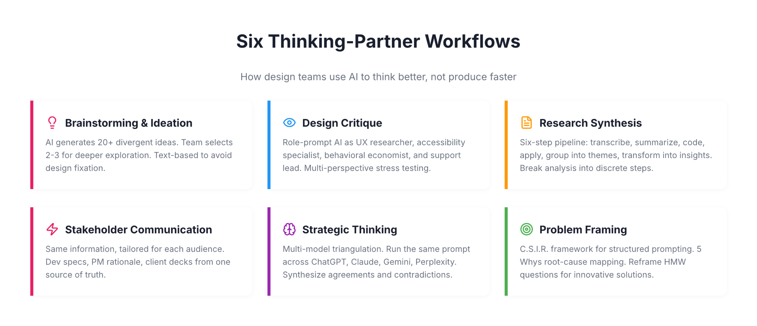 The most compelling evidence for AI as thinking partner comes from practitioners documenting specific workflows. These fall into six categories that map directly to how agency design leads structure their work.